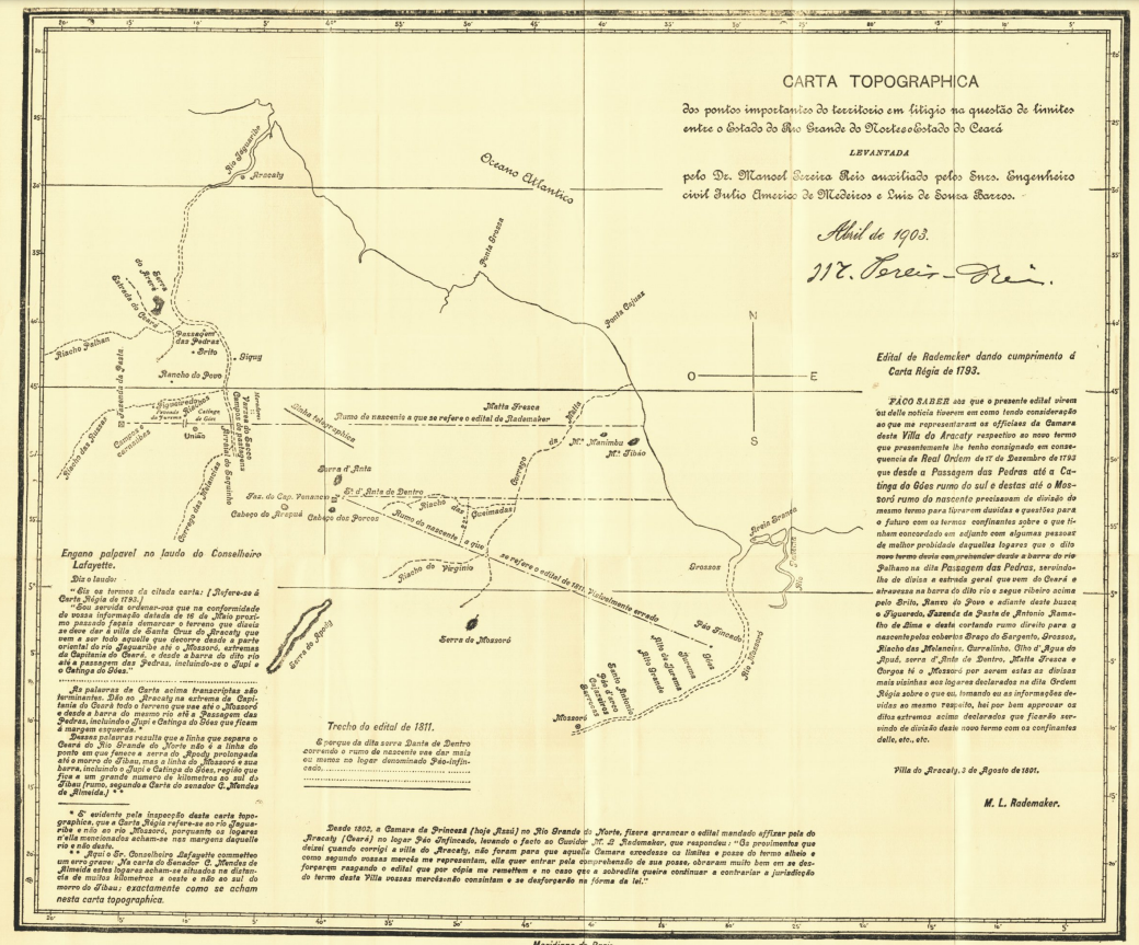 Para embasar a petição, Antônio Sabino elencou inúmeros documentos comprobatórios de que desde os primórdios da ocupação colonial a referida região estava agregada ao território cearense, cujos limites encontravam-se delimitados pelo rio Mossoró e por um marco fixado nas imediações da praia de Touros. Essa delimitação havia sido informada em uma data de sesmaria concedida pelo capitão-mor do Ceará, Sebastião de Sá, a João de Freitas Correa e Dona Maria Cesar, ainda no ano de 1681. Em 1700, os oficiais da Câmara da Vila de São José de Ribamar formularam outro documento em que validavam essa delimitação.